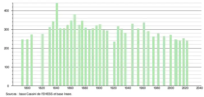 L'évolution du nombre d'habitants est connue à travers les recensements de la population effectués dans la commune depuis 1793. Pour les communes de moins de 10 000 habitants, une enquête de recensement portant sur toute la population est réalisée tous les cinq ans, les populations de référence des années intermédiaires étant quant à elles estimées par interpolation ou extrapolation[24]. Pour la commune, le premier recensement exhaustif entrant dans le cadre du nouveau dispositif a été réalisé en 2007[25].