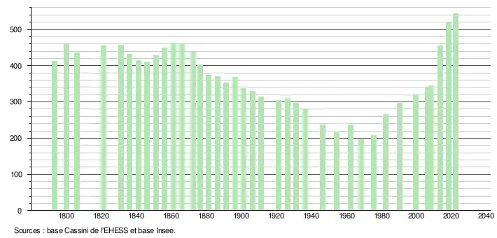 L'évolution du nombre d'habitants est connue à travers les recensements de la population effectués dans la commune depuis 1793. Pour les communes de moins de 10 000 habitants, une enquête de recensement portant sur toute la population est réalisée tous les cinq ans, les populations de référence des années intermédiaires étant quant à elles estimées par interpolation ou extrapolation[12]. Pour la commune, le premier recensement exhaustif entrant dans le cadre du nouveau dispositif a été réalisé en 2008[13].
