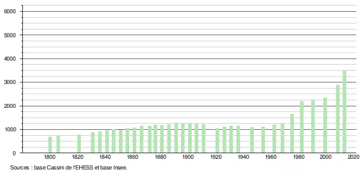L'évolution du nombre d'habitants est connue à travers les recensements de la population effectués dans la commune depuis 1800. À partir du , les populations légales des communes sont publiées annuellement dans le cadre d'un recensement qui repose désormais sur une collecte d'information annuelle, concernant successivement tous les territoires communaux au cours d'une période de cinq ans. Pour les communes de moins de 10 000 habitants, une enquête de recensement portant sur toute la population est réalisée tous les cinq ans, les populations légales des années intermédiaires étant quant à elles estimées par interpolation ou extrapolation[20]. Pour la commune, le premier recensement exhaustif entrant dans le cadre du nouveau dispositif a été réalisé en 2008[21],[Note 1].