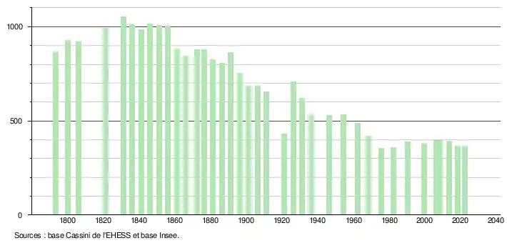 L'évolution du nombre d'habitants est connue à travers les recensements de la population effectués dans la commune depuis 1793. Pour les communes de moins de 10 000 habitants, une enquête de recensement portant sur toute la population est réalisée tous les cinq ans, les populations de référence des années intermédiaires étant quant à elles estimées par interpolation ou extrapolation[21]. Pour la commune, le premier recensement exhaustif entrant dans le cadre du nouveau dispositif a été réalisé en 2008[22].