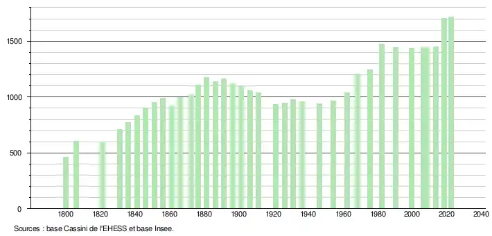 L'évolution du nombre d'habitants est connue à travers les recensements de la population effectués dans la commune depuis 1800. Pour les communes de moins de 10 000 habitants, une enquête de recensement portant sur toute la population est réalisée tous les cinq ans, les populations de référence des années intermédiaires étant quant à elles estimées par interpolation ou extrapolation[28]. Pour la commune, le premier recensement exhaustif entrant dans le cadre du nouveau dispositif a été réalisé en 2008[29].