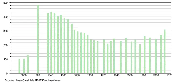 - ↑ Par convention dans Wikipédia, le principe a été retenu de n’afficher dans le tableau des recensements et le graphique, pour les populations légales postérieures à 1999, que les populations correspondant à une enquête exhaustive de recensement pour les communes de moins de 10 000 habitants, et que les populations des années 2006, 2011, 2016, etc. pour les communes de plus de 10 000 habitants, ainsi que la dernière population légale publiée par l’Insee pour l'ensemble des communes.