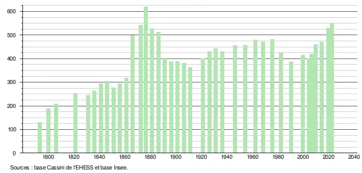 L'évolution du nombre d'habitants est connue à travers les recensements de la population effectués dans la commune depuis 1793. Pour les communes de moins de 10 000 habitants, une enquête de recensement portant sur toute la population est réalisée tous les cinq ans, les populations de référence des années intermédiaires étant quant à elles estimées par interpolation ou extrapolation[25]. Pour la commune, le premier recensement exhaustif entrant dans le cadre du nouveau dispositif a été réalisé en 2004[26].
