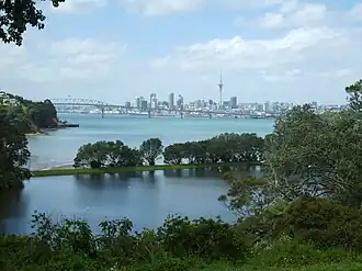 Cet isthme formant la zone urbaine centrale, est entouré de deux ports naturels[8] : le port de Waitemata au nord, qui s'ouvre à l'est sur le golfe de Hauraki (océan Pacifique), et le port de Manukau au sud, qui s'ouvre à l'ouest sur la mer de Tasman. C'est l'une des rares villes au monde à avoir deux ports sur deux aussi importantes étendues d'eau[9], et la ville est marquée par cette particularité[10].