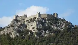 Le pic du Canigou depuis le château de Quéribus à Cucugnan dans le département de l'Aude, dans le sud.
