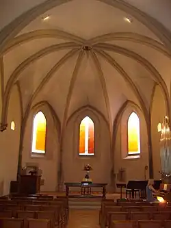 Les vitraux ont été réalisés entre 2004 et 2007 par l'artiste français d'origine allemande Udo Zembok. Ils se composent de grands verres monolithiques, sans plombs, réalisés dans une technique récente de plaques colorées par pigments, fusionnées et thermoformées. On compte neuf vitraux, dont quatre — les plus grands — sont principalement rouges, et cinq, plus petits, sont principalement bleus.