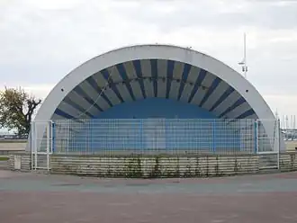 Cet édifice, qui s'inscrit dans la mouvance moderniste, se compose d'une coque en béton armé recouvrant une scène dont le soubassement masque des vestiaires et des pièces annexes semi-enterrées.