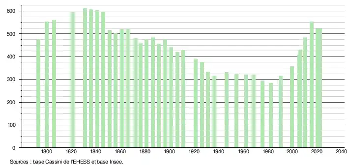 L'évolution du nombre d'habitants est connue à travers les recensements de la population effectués dans la commune depuis 1793. Pour les communes de moins de 10 000 habitants, une enquête de recensement portant sur toute la population est réalisée tous les cinq ans, les populations de référence des années intermédiaires étant quant à elles estimées par interpolation ou extrapolation[38]. Pour la commune, le premier recensement exhaustif entrant dans le cadre du nouveau dispositif a été réalisé en 2005[39].