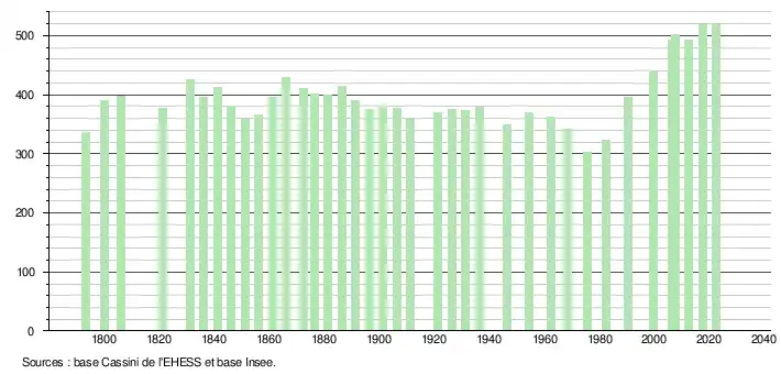 L'évolution du nombre d'habitants est connue à travers les recensements de la population effectués dans la commune depuis 1793. Pour les communes de moins de 10 000 habitants, une enquête de recensement portant sur toute la population est réalisée tous les cinq ans, les populations de référence des années intermédiaires étant quant à elles estimées par interpolation ou extrapolation[26]. Pour la commune, le premier recensement exhaustif entrant dans le cadre du nouveau dispositif a été réalisé en 2007[27].