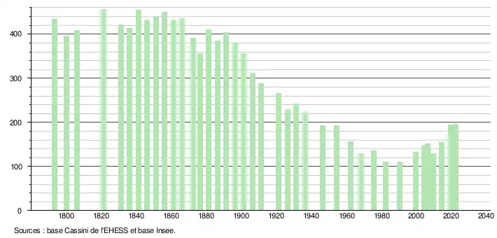 L'évolution du nombre d'habitants est connue à travers les recensements de la population effectués dans la commune depuis 1793. Pour les communes de moins de 10 000 habitants, une enquête de recensement portant sur toute la population est réalisée tous les cinq ans, les populations de référence des années intermédiaires étant quant à elles estimées par interpolation ou extrapolation[14]. Pour la commune, le premier recensement exhaustif entrant dans le cadre du nouveau dispositif a été réalisé en 2004[15].