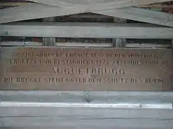 Une plaque commémorative est apposée sur laquelle est écrite : « Hunzigenbrücke erbaut 1835 in der Hunzigenau. Versetzt und restauriert 1973-74 / Umbenannt in Auguetbrugg. Die Brücke steht unter dem Schutz des Bundes. » Ce qui signifie : « L'Hunzigenbrücke est construit en 1835 dans le Hunzigenau. Déplacé et restauré en 1973-1974 / renommé Auguetbrugg. Le pont est sous la protection de la Confédération suisse. »