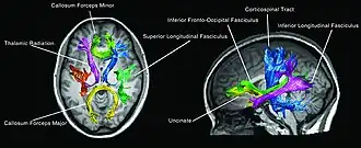 Au sein de la substance blanche du cerveau, les Dejerine distinguent des fibres nerveuses organisées en faisceaux reliant différentes zones de substance grise, du cortex à des structures sous-jacentes comme les noyaux gris centraux[27].