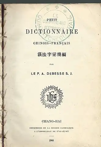 Dans son Introduction à la 1re édition du dictionnaire français-chinois le père Debesse écrit : « Lors des excursions (sic) fréquentes dans la vie de missionnaire, nous avons été frappé d'un inconvénient que présentent la plupart des dictionnaires : leurs dimensions, par trop volumineuses. ». À l'époque, en effet, on se déplaçait souvent mais difficilement. Les missionnaires dispersés dans l'arrière-pays utilisaient « l'âne, le cheval, la mule, la barque, le char à bœufs, la brouette, la chaise à porteur »[10]. Il imagine alors de composer un "dictionnaire de poche", s'inspirant d'ouvrages antérieurs qu'il enrichit, notamment ceux des jésuites Séraphin Couvreur et Henri Boucher, de Paul Perny des Missions Étrangères, Lemaire et Giquel qu'il cite dans cette même introduction. Le Petit Dictionnaire français-chinois est publié en 1900 ; l'ouvrage de 531 pages, de format in-16 (15.5 cm x 11 cm), sur papier fin et sous une couverture de cuir souple, est réalisé par l'imprimerie jésuite de l'orphelinat de T'ou-sè-wè (aujourd'hui Tushanwan) à Zi-ka-wei.