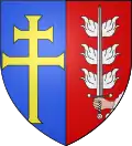 Famille Viesse de Marmont sous l'Ancien Régime : D'azur, à une croix à double traverse et pattée d'or ; parti de gueules, à une main de carnation, sortant d'une nuée d'argent mouvant de la partition, et tenant une épée flamboyante d'argent.[13],[14],[15] |