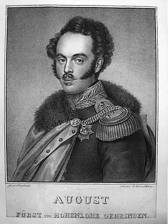 Le prince Auguste est le seul fils, parmi sept sœurs, du prince Frédéric-Louis de Hohenlohe-Ingelfingen (1746-1818) et de la princesse, née comtesse von Hoym (1763-1840). Il hérite des biens de son père en 1806 qui ne voulait pas que sa principauté passe au royaume de Wurtemberg. Le titre de prince devient alors Hohenlohe-Öhringen. Le prince entre toutefois au service du Wurtemberg. Il préside l'assemblée des seigneurs du Wurtemberg en 1815-1816 et de 1820 à 1830 la chambre royale des seigneurs du Wurtemberg. Il sera premier camérier de cette institution jusqu'en 1849. Ses fils Hugues et Frédéric en font aussi partie.