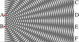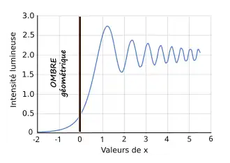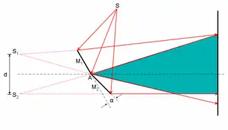 Fresnel a donc traité les bords de l'obstacle comme deux sources ponctuelles cohérentes. Il a reproduit avec cet autre dispositif, l'expérience des doubles fentes que Young avait conduite 15 ans plus tôt et a retrouvé les mêmes résultats. Il a cependant prouvé que, avec la théorie ondulatoire, il pouvait expliquer le phénomène de la diffraction.