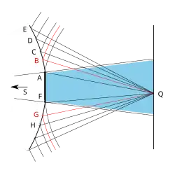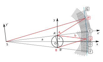 Pour trouver la formule qui donne la distance entre les franges, il fait une construction géométrique en traçant les cercles centrés au bord de l'obstacle et de rayons successifs augmentés d'une demie longueur d'onde[47]. Si S est la source, O, l'axe du fil de fer vu en coupe et l'origine du repère cartésien xOy, , le diamètre du fil de fer, la distance , la distance , x et y les coordonnées du point Q d'observation sur l'écran, les équations des cercles centrés en A ou en B s'écrivent :