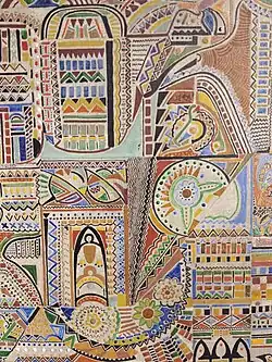Il utilise de préférence des couleurs pures avec un pinceau pour chacune d'elles, couleurs disposées dans des godets. Presque toujours abstraites, on peut trouver cependant dans ces peintures, ici et là, minuscules, des visages ou des oiseaux, géométrisés, qui se lovent dans les constructions. La composition n’occupe pas la totalité de la surface, elle se découpe sur un fond uni, et laisse apparaître des coupoles et des tourelles.