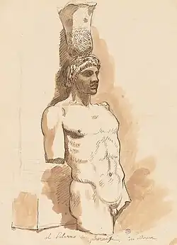 - Fragment d'un atlante canéphore, pierre noire, plume, encre brune et lavis brun, H. 0,286 ; L. 0,200 m[9], dessin qui se distingue des études dessinées de ses camarades artistes en proposant un point de vue particulier et qui suggère la prise de motif sur le vif à l'occasion d'une découverte archéologique[12].