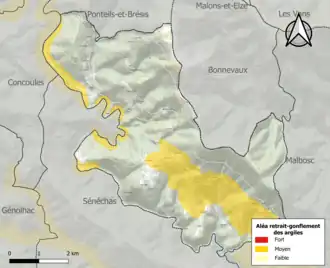 Le retrait-gonflement des sols argileux est susceptible d'engendrer des dommages importants aux bâtiments en cas d’alternance de périodes de sécheresse et de pluie. 22,3 % de la superficie communale est en aléa moyen ou fort (67,5 % au niveau départemental et 48,5 % au niveau national). Sur les 177 bâtiments dénombrés sur la commune en 2019, 77 sont en aléa moyen ou fort, soit 44 %, à comparer aux 90 % au niveau départemental et 54 % au niveau national. Une cartographie de l'exposition du territoire national au retrait gonflement des sols argileux est disponible sur le site du BRGM[20],[Carte 2].