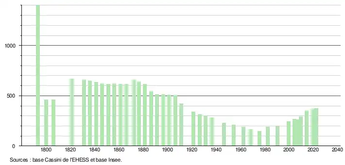 | L'évolution du nombre d'habitants est connue à travers les recensements de la population effectués dans la commune depuis 1793. Pour les communes de moins de 10 000 habitants, une enquête de recensement portant sur toute la population est réalisée tous les cinq ans, les populations de référence des années intermédiaires étant quant à elles estimées par interpolation ou extrapolation[37]. Pour la commune, le premier recensement exhaustif entrant dans le cadre du nouveau dispositif a été réalisé en 2004[38]. En 2022, la commune comptait 376 habitants[Note 4], en évolution de +3,58 % par rapport à 2016 (Lot : +1,31 %, France hors Mayotte : +2,11 %). |