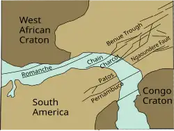 Ainsi, l'ouverture de l'océan Atlantique sud a débuté au sud des continents sud-américain et africain, à partir d'un point triple situé dans l'actuel golfe de Guinée, d'où elle s'est poursuivie vers l'ouest. Le fossé de la Bénoué et le rift d'Afrique centrale, orientés vers le NE, constituent le bras avorté de cette jonction[5].