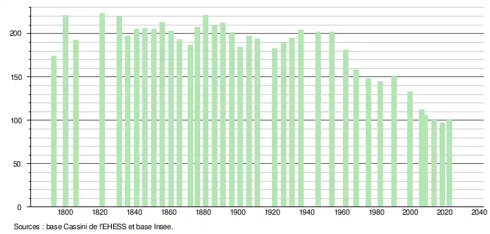 L'évolution du nombre d'habitants est connue à travers les recensements de la population effectués dans la commune depuis 1793. Pour les communes de moins de 10 000 habitants, une enquête de recensement portant sur toute la population est réalisée tous les cinq ans, les populations de référence des années intermédiaires étant quant à elles estimées par interpolation ou extrapolation[25]. Pour la commune, le premier recensement exhaustif entrant dans le cadre du nouveau dispositif a été réalisé en 2008[26].