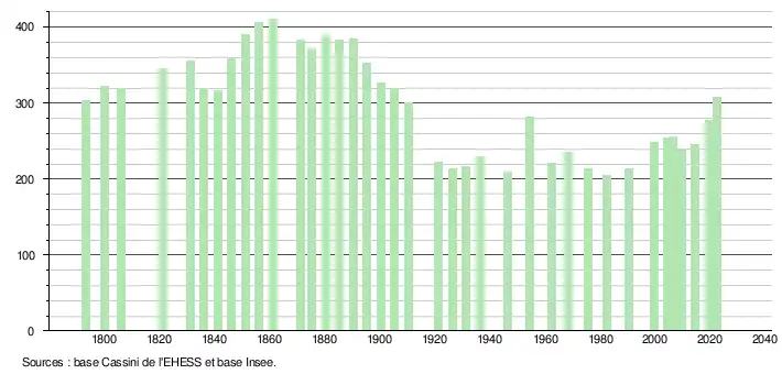 L'évolution du nombre d'habitants est connue à travers les recensements de la population effectués dans la commune depuis 1793. Pour les communes de moins de 10 000 habitants, une enquête de recensement portant sur toute la population est réalisée tous les cinq ans, les populations de référence des années intermédiaires étant quant à elles estimées par interpolation ou extrapolation[17]. Pour la commune, le premier recensement exhaustif entrant dans le cadre du nouveau dispositif a été réalisé en 2004[18].