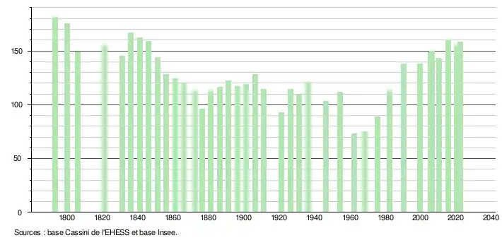 L'évolution du nombre d'habitants est connue à travers les recensements de la population effectués dans la commune depuis 1793. Pour les communes de moins de 10 000 habitants, une enquête de recensement portant sur toute la population est réalisée tous les cinq ans, les populations de référence des années intermédiaires étant quant à elles estimées par interpolation ou extrapolation[19]. Pour la commune, le premier recensement exhaustif entrant dans le cadre du nouveau dispositif a été réalisé en 2005[20].