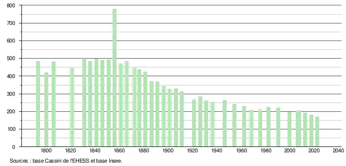 L'évolution du nombre d'habitants est connue à travers les recensements de la population effectués dans la commune depuis 1793. Pour les communes de moins de 10 000 habitants, une enquête de recensement portant sur toute la population est réalisée tous les cinq ans, les populations de référence des années intermédiaires étant quant à elles estimées par interpolation ou extrapolation[31]. Pour la commune, le premier recensement exhaustif entrant dans le cadre du nouveau dispositif a été réalisé en 2007[32].