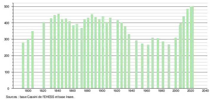 L'évolution du nombre d'habitants est connue à travers les recensements de la population effectués dans la commune depuis 1793. Pour les communes de moins de 10 000 habitants, une enquête de recensement portant sur toute la population est réalisée tous les cinq ans, les populations de référence des années intermédiaires étant quant à elles estimées par interpolation ou extrapolation[27]. Pour la commune, le premier recensement exhaustif entrant dans le cadre du nouveau dispositif a été réalisé en 2005[28].