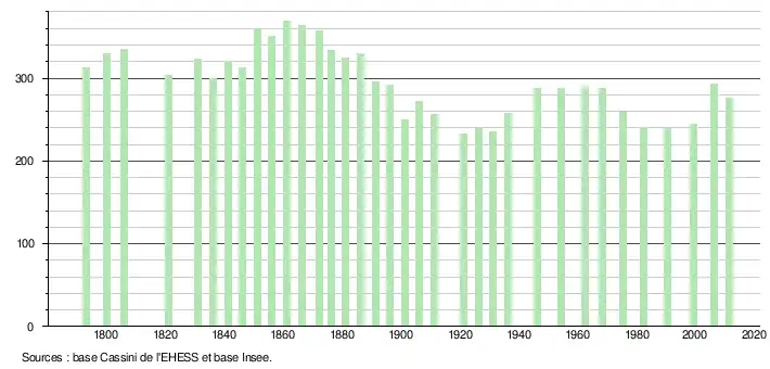 L'évolution du nombre d'habitants est connue à travers les recensements de la population effectués dans la commune depuis 1793. À partir du , les populations légales des communes sont publiées annuellement dans le cadre d'un recensement qui repose désormais sur une collecte d'information annuelle, concernant successivement tous les territoires communaux au cours d'une période de cinq ans. Pour les communes de moins de 10 000 habitants, une enquête de recensement portant sur toute la population est réalisée tous les cinq ans, les populations légales des années intermédiaires étant quant à elles estimées par interpolation ou extrapolation[22]. Pour la commune, le premier recensement exhaustif entrant dans le cadre du nouveau dispositif a été réalisé en 2006[23],[Note 1].