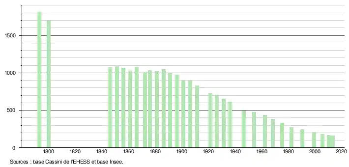 L'évolution du nombre d'habitants est connue à travers les recensements de la population effectués dans la commune depuis 1793. À partir du , les populations légales des communes sont publiées annuellement dans le cadre d'un recensement qui repose désormais sur une collecte d'information annuelle, concernant successivement tous les territoires communaux au cours d'une période de cinq ans. Pour les communes de moins de 10 000 habitants, une enquête de recensement portant sur toute la population est réalisée tous les cinq ans, les populations légales des années intermédiaires étant quant à elles estimées par interpolation ou extrapolation[3]. Pour la commune, le premier recensement exhaustif entrant dans le cadre du nouveau dispositif a été réalisé en 2005[4],[Note 1].