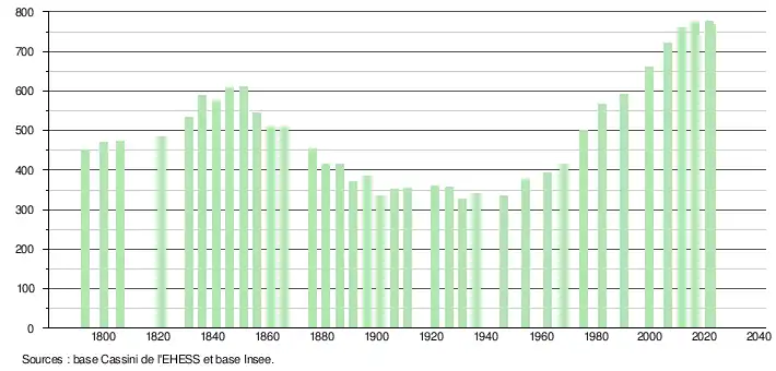 L'évolution du nombre d'habitants est connue à travers les recensements de la population effectués dans la commune depuis 1793. Pour les communes de moins de 10 000 habitants, une enquête de recensement portant sur toute la population est réalisée tous les cinq ans, les populations de référence des années intermédiaires étant quant à elles estimées par interpolation ou extrapolation[22]. Pour la commune, le premier recensement exhaustif entrant dans le cadre du nouveau dispositif a été réalisé en 2006[23].