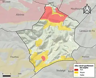 Le retrait-gonflement des sols argileux est susceptible d'engendrer des dommages importants aux bâtiments en cas d’alternance de périodes de sécheresse et de pluie. 30,7 % de la superficie communale est en aléa moyen ou fort (75,2 % au niveau départemental et 48,5 % au niveau national). Sur les 36 bâtiments dénombrés sur la commune en 2019, 18 sont en aléa moyen ou fort, soit 50 %, à comparer aux 94 % au niveau départemental et 54 % au niveau national. Une cartographie de l'exposition du territoire national au retrait gonflement des sols argileux est disponible sur le site du BRGM[29],[Carte 3].