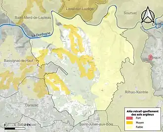 La commune est vulnérable au risque de mouvements de terrains constitué principalement du retrait-gonflement des sols argileux[15]. Cet aléa est susceptible d'engendrer des dommages importants aux bâtiments en cas d’alternance de périodes de sécheresse et de pluie. 15,2 % de la superficie communale est en aléa moyen ou fort (26,8 % au niveau départemental et 48,5 % au niveau national). Sur les 244 bâtiments dénombrés sur la commune en 2019, 49 sont en aléa moyen ou fort, soit 20 %, à comparer aux 36 % au niveau départemental et 54 % au niveau national. Une cartographie de l'exposition du territoire national au retrait gonflement des sols argileux est disponible sur le site du BRGM[16],[Carte 2].