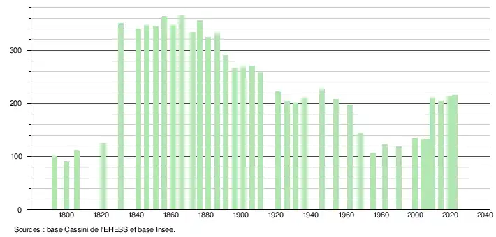 | L'évolution du nombre d'habitants est connue à travers les recensements de la population effectués dans la commune depuis 1793. Pour les communes de moins de 10 000 habitants, une enquête de recensement portant sur toute la population est réalisée tous les cinq ans, les populations de référence des années intermédiaires étant quant à elles estimées par interpolation ou extrapolation[28]. Pour la commune, le premier recensement exhaustif entrant dans le cadre du nouveau dispositif a été réalisé en 2004[29]. En 2022, la commune comptait 215 habitants[Note 5], en évolution de +6,97 % par rapport à 2016 (Gers : +1,04 %, France hors Mayotte : +2,11 %). |