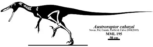 - ↑ (en) Philip J. Currie et Ariana Paulina Carabajal, « A new specimen of Austroraptor cabazi Novas, Pol, Canale, Porfiri and Calvo, 2008 (Dinosauria, Theropoda, Unenlagiidae) from the Latest Cretaceous (Maastrichtian) of Río Negro, Argentina », Ameghiniana, vol. 49, no 4, , p. 662-667 (lire en ligne).