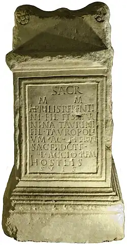 - À la Grande Mère, Aprilis, fils de Repentinus, et Saturnina, fille de Taurinus, ont reçu le taurobole, avec leurs victimes. Lucius Accius Remus étant prêtre.