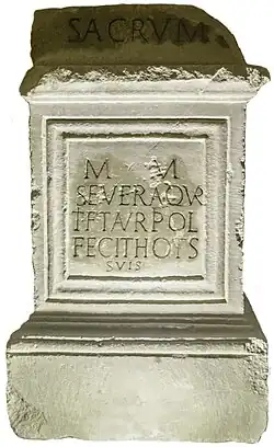 - À la Grande Mère. Antonia Prima a fait un taurobole avec ses propres victimes. Zminthius (affranchi) de Proculianus et Pacius (affranchi) d’Agrippa étant prêtres, sous le deuxième consulat de Pollio et d’Aper, le quinzième jour avant les calendes de novembre.