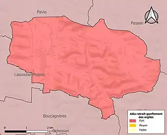 Le retrait-gonflement des sols argileux est susceptible d'engendrer des dommages importants aux bâtiments en cas d’alternance de périodes de sécheresse et de pluie. La totalité de la commune est en aléa moyen ou fort (94,5 % au niveau départemental et 48,5 % au niveau national). Sur les 252 bâtiments dénombrés sur la commune en 2019, 252 sont en aléa moyen ou fort, soit 100 %, à comparer aux 93 % au niveau départemental et 54 % au niveau national. Une cartographie de l'exposition du territoire national au retrait gonflement des sols argileux est disponible sur le site du BRGM[24],[Carte 3].