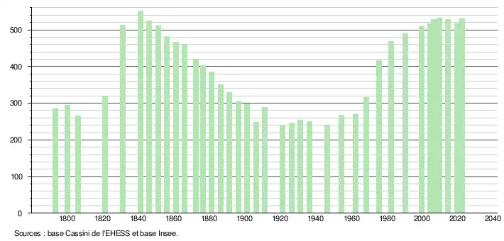 | L'évolution du nombre d'habitants est connue à travers les recensements de la population effectués dans la commune depuis 1793. Pour les communes de moins de 10 000 habitants, une enquête de recensement portant sur toute la population est réalisée tous les cinq ans, les populations de référence des années intermédiaires étant quant à elles estimées par interpolation ou extrapolation[30]. Pour la commune, le premier recensement exhaustif entrant dans le cadre du nouveau dispositif a été réalisé en 2004[31]. En 2022, la commune comptait 530 habitants[Note 4], en évolution de +1,53 % par rapport à 2016 (Gers : +1,04 %, France hors Mayotte : +2,11 %). |