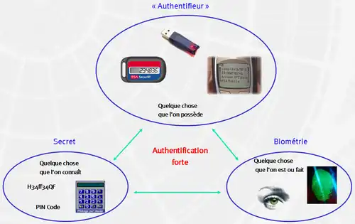 - ↑ ANSSI, « Recommandations relatives à l’authentification multifacteur et aux mots de passe » [PDF], (consulté le )Voir notamment la section 2.5 consacrée aux différences entre authentification forte et authentification mutifacteur.