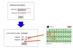 - L'authentification à carte matricielle (ou Matrix card authentication). Il s'agit de rentrer un OTP provenant d'une carte matricielle fournie. Ce système utilise les coordonnées en Y et X. La carte matricielle est considérée comme un authentifieur.