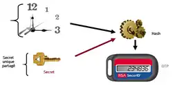 - authentifieur fondé sur le temps. Ces authentifieurs utilisent, en plus du secret partagé, un dénominateur commun qui est le temps. Chaque partie est synchronisée sur le temps universel coordonné (UTC). On utilise alors un code PIN comme deuxième facteur d'authentification. Ces authentifieurs sont définis comme une technologie dite synchrone. Chaque minute, par exemple, ces authentifieurs affichent un nouveau « token », le One Time Password. L'exemple le plus connu est le SecurID de la société RSA Security.