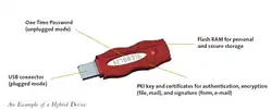 - Authentifieur USB. Ces authentifieurs utilisent la même technologie cryptographique que les cartes à puces. Ce type d'authentifieur est capable de stocker, générer du matériel cryptographique de façon très sécurisée. Ces authentifieurs sont définis comme une technologie dite connectée. En d'autres termes, il est nécessaire de « brancher » cet authentifieur sur l'ordinateur via le port USB. L'inconvénient majeur de cette technologie est qu'elle n'est pas vraiment portable. Par exemple, il est difficile d'utiliser son authentifieur USB sur une borne internet (dans un « kiosque », un hôtel, etc.).