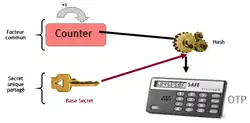 - authentifieur fondé sur un compteur. Ces authentifieurs utilisent, en plus du secret partagé, un dénominateur commun qui est un compteur. Chaque partie se synchronise sur le compteur. On utilise alors un code PIN comme deuxième facteur d'authentification. Le code PIN peut être entré sur un mini clavier. Comme la technologie fondée sur le temps, ces authentifieurs ne sont pas capables d'offrir la non-répudiation.