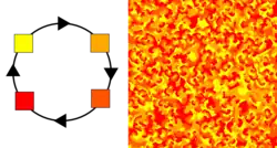 À gauche, une règle locale simple : une cellule passe d'un état (i) au suivant (i+1) dans le cycle d'états dès que i+1 est présent dans au moins 3 des 8 cellules voisines. À droite, le résultat (complexe) de l'application répétée de cette règle sur une grille de cellules. Ce type d'automates cellulaires a été découvert par D. Griffeath.