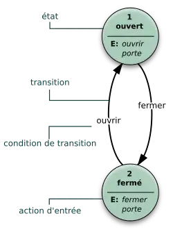 Un état est la description de la configuration d'un système en attente d'exécuter une transition. Une transition est un ensemble d'actions à exécuter lorsqu'une condition est remplie ou lorsqu'un événement est reçu. Par exemple, une chaîne audio peut être dans un état « radio » et, quand elle reçoit un stimulus du genre « suivant », passe à la station radio suivante. Si le système est dans l'état « CD » et reçoit le stimulus « suivant », il passe à la piste suivante du CD en cours. Les mêmes stimuli peuvent donc déclencher des actions différentes, si l'état courant n'est pas le même.
