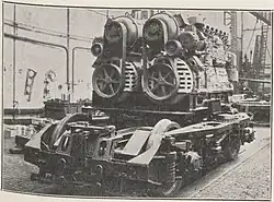 Le bogie situé au-dessous de la salle des machines supporte les deux groupes moteur-génératrice, fixés presque parallèlement sur son châssis ; les essieux sont porteurs. Ce sont les essieux du bogie opposé qui sont motorisés, à raison d'un moteur par essieu (configuration d'essieux 2'Bo')[2].